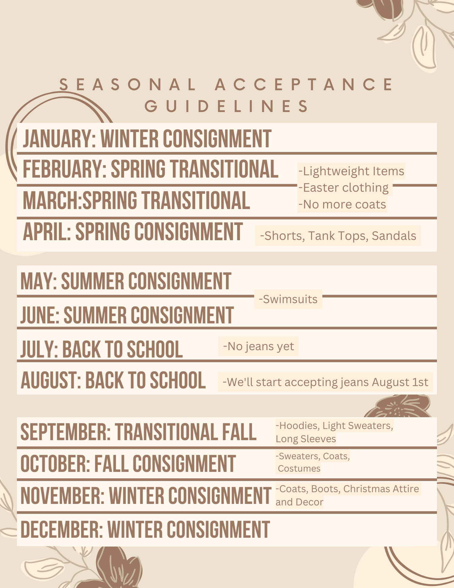 Check out our consignment calendar found below! It will tell you all the details about what season of clothes we're currently accepting! As for homegoods, please send pictures to 918-625-6959.